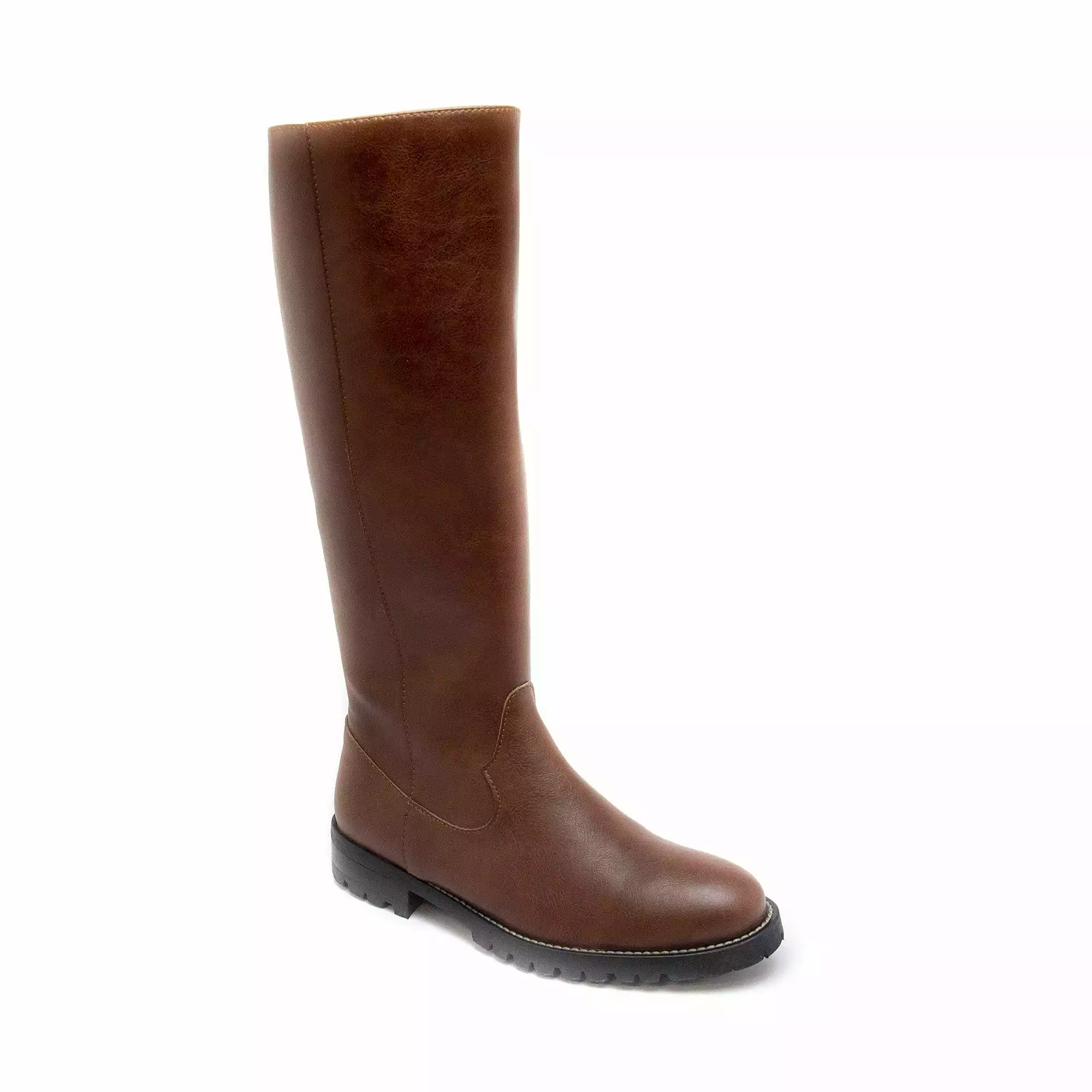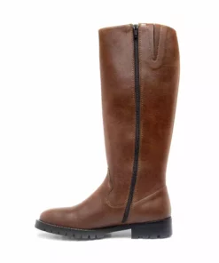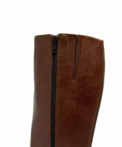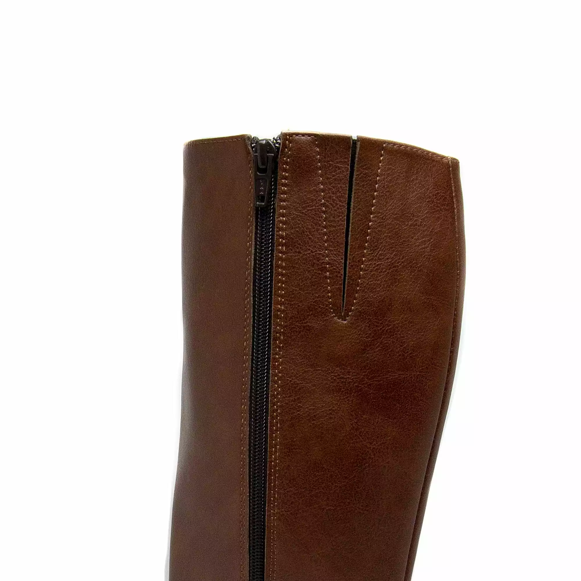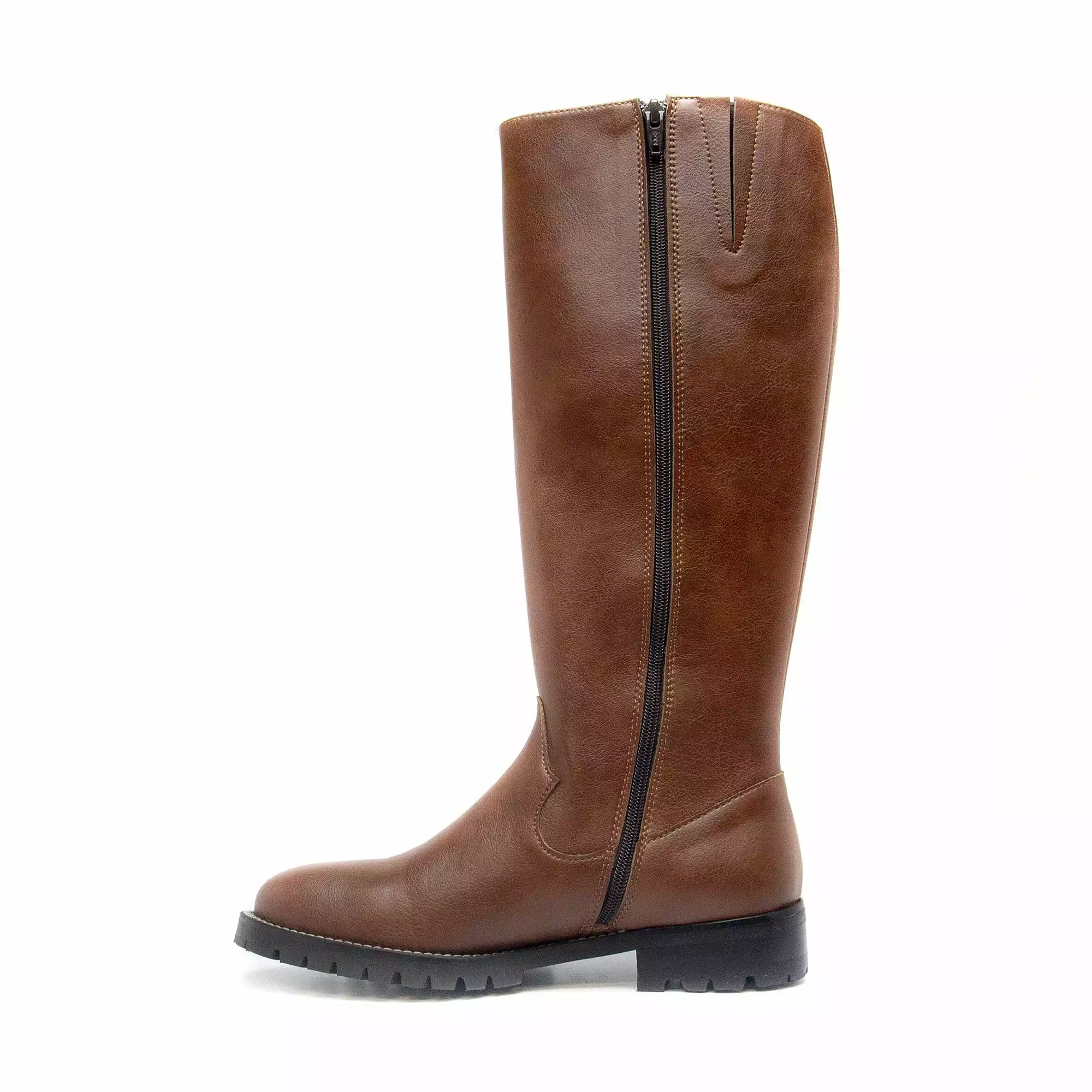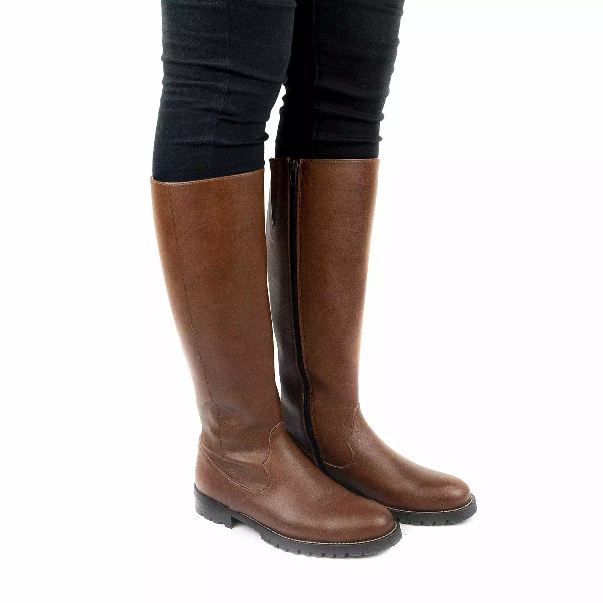 Women’s vegan knee high boots made from ecological microfibre, featuring a black zipper closure.