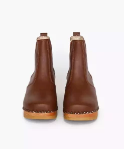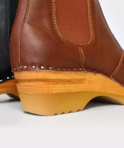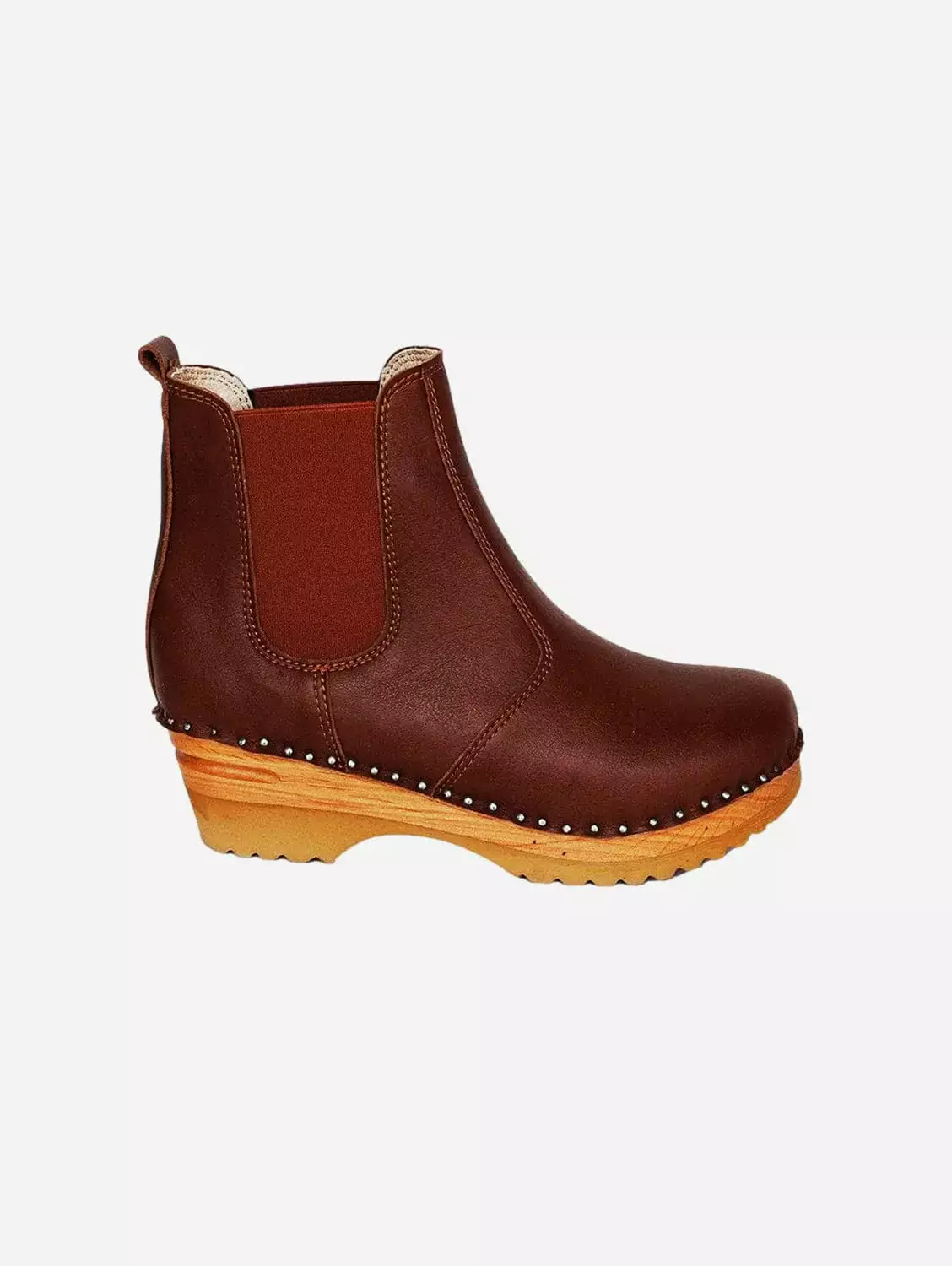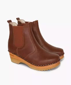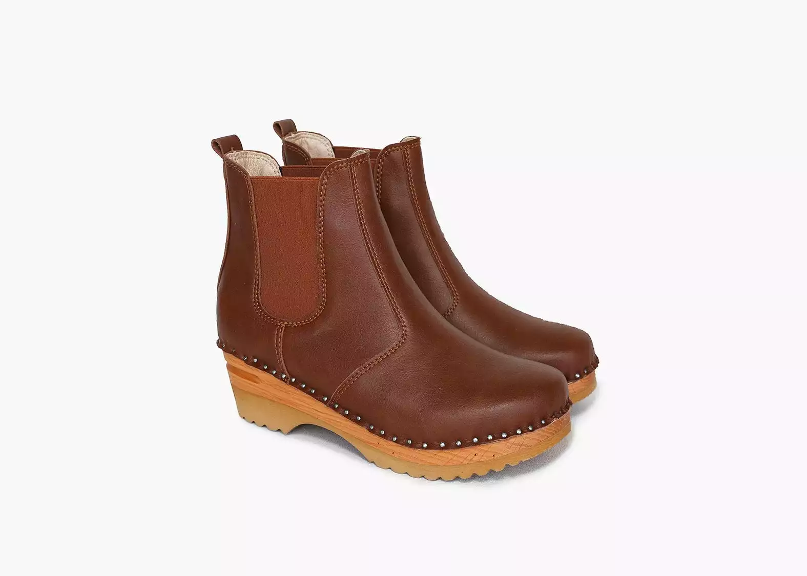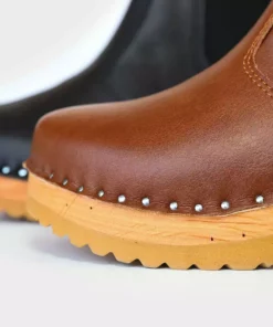 ROCKWELL Brown Vegan Leather Chelsea Clog boots are a variation on the traditional Swedish clogs. They are the latest addition to the ongoing collaboration with Swedish friends at Troentorp. They will be perfect with a pair of knee-high socks to keep you cozy and warm this winter. Very comfortable, the non-slippery sole is ideal for rainy weather. The upper is also waterproof and easy to clean.
