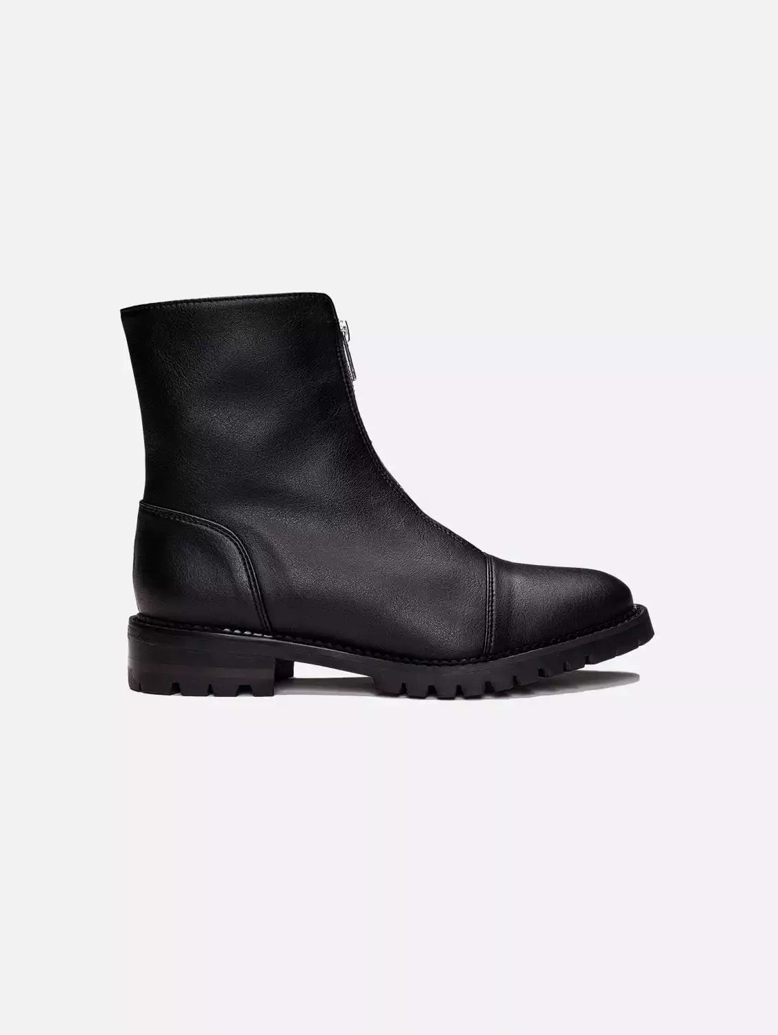 Tecla, the smart, minimalist zip-up ankle boot with a toe-cap shape, made with high-quality vegan leather; a sustainable, innovative, cruelty-free, water-resistant, and durable material.